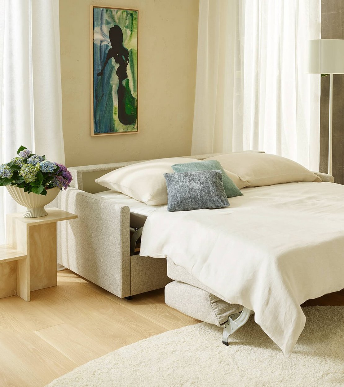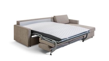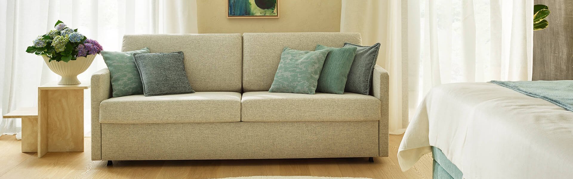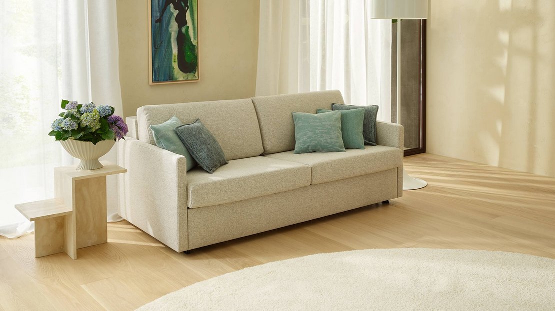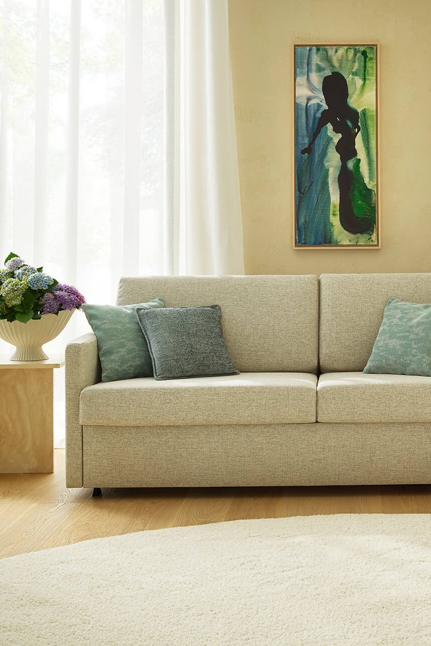 Ganz besonders gut schlafen werden Ihre Gäste auf dem Längsschläfer Marea. Er macht nicht nur optisch durch sein zeitloses Design eine gute Figur, in dem Schlafsofa verbirgt sich eine echte Matratze. Auf dem Längsschläfer schläft man tatsächlich wie in einem richtigen Doppelbett. Mit nur zwei Handgriffen verwandeln Sie den Zweisitzer in ein vollwertiges Bett mit loser 14 cm hoher Schaumstoff-Matratze, Deckblatt abnehmbar und bis 60 °C waschbar.