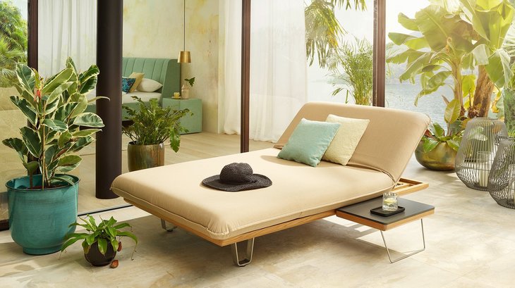 Bezogen wird die edle Liege mit UV-beständigen Sonnensegel-Stoffen, die bereits bestens im Außenbereich erprobt sind. Der Rahmen aus Eiche und die Elemente aus Edelstahl verleihen dem Möbel den außergewöhnlichen und hochwertigen Charakter.