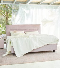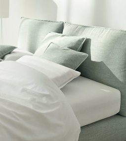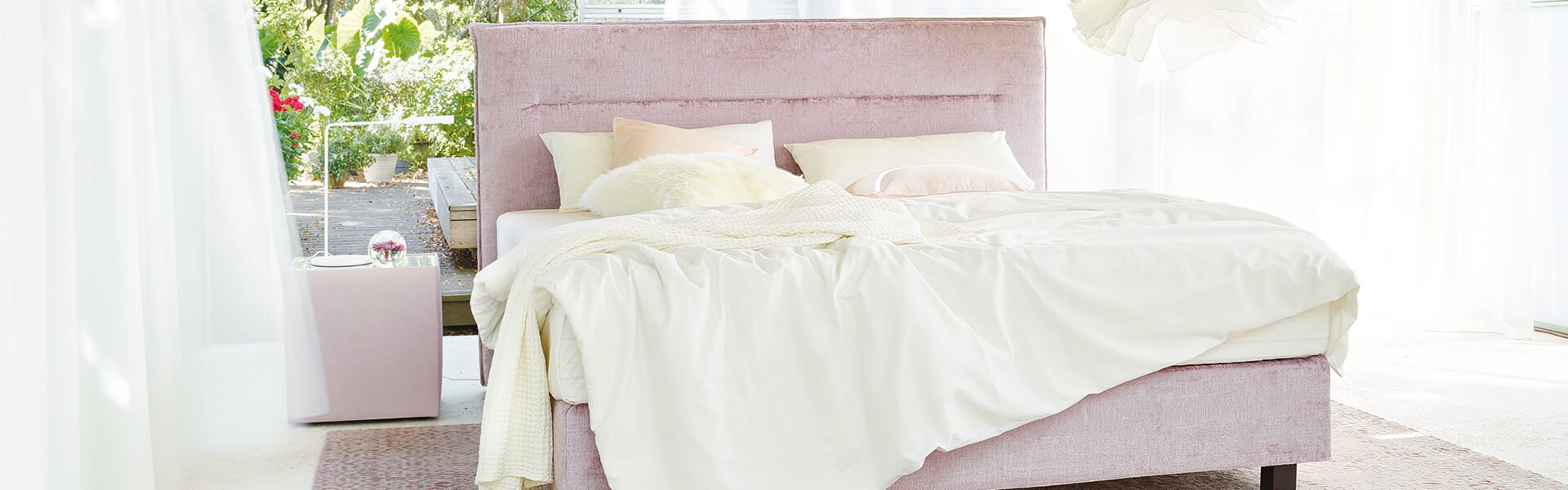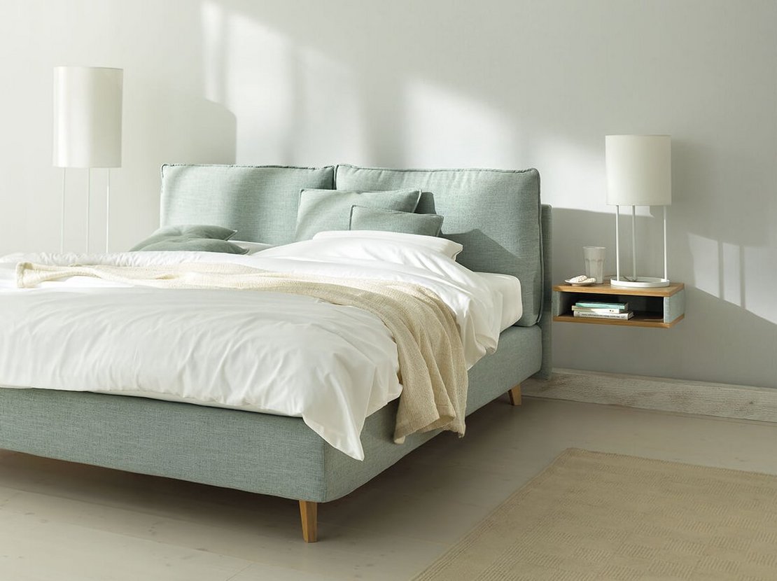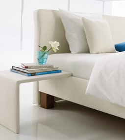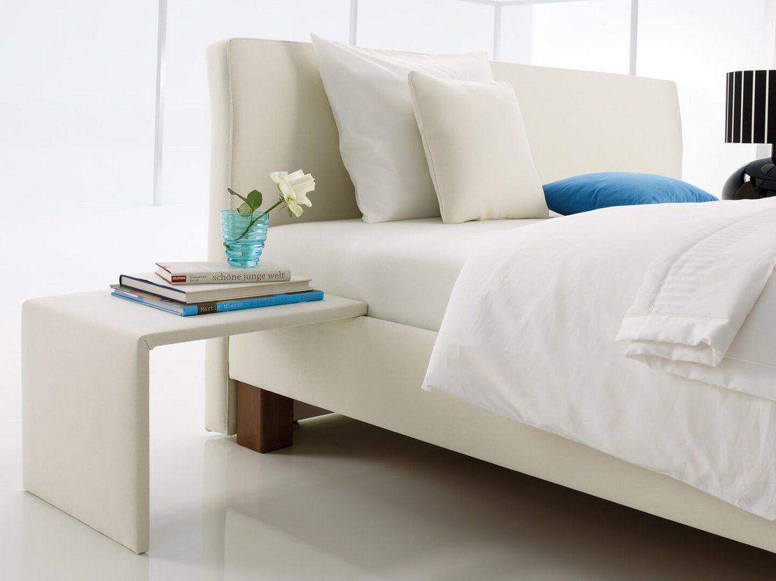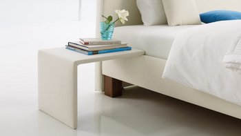Slim and elegant is the fabric-covered nightstand of the bed series Calma, which is simply attached to the edge of the bed.