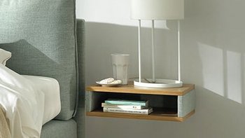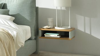 For our box spring bed Arte we have designed a particularly elegant nightstand with exposed wood parts and fabric-covered side parts. Since the nightstand is attached to the wall, it literally "floats".