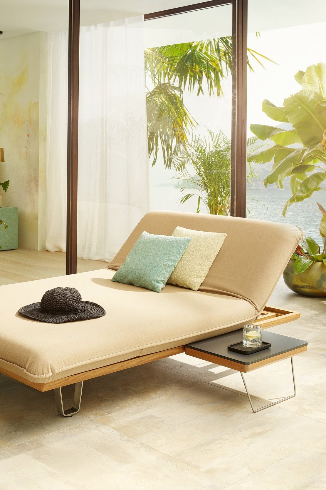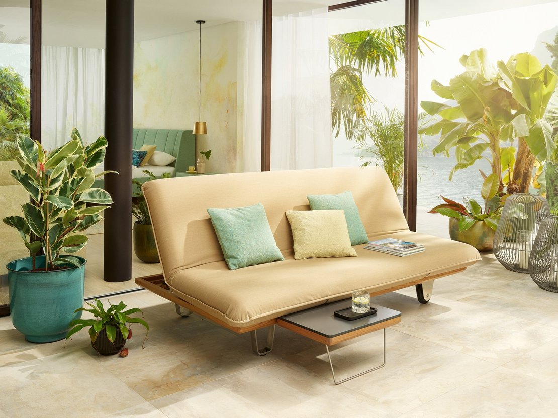 Da die Sonnenliege "Sunbed" sowohl links als auch rechts nach oben geklappt werden kann, quasi wie Schmetterlingsflügel – daher auch der Name Butterfly – machen sogar zwei Einhängetische Sinn. Für diesen Fall gibt es eine integrierte Ablage, die auch zwei Tische aufnehmen kann.