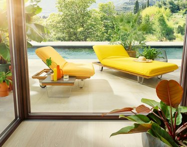 Zur Outdoor-Möbelserie gehört auch der Hocker Butterfly "Sunseat", der ebenfalls in zwei Relax-Positionen hochgeklappt werden kann. Outdoorliege und Sitzhocker sind jeweils mit zwei Edelstahlkufen und zwei Rollen für einen leichteren Ortswechsel ausgestattet.