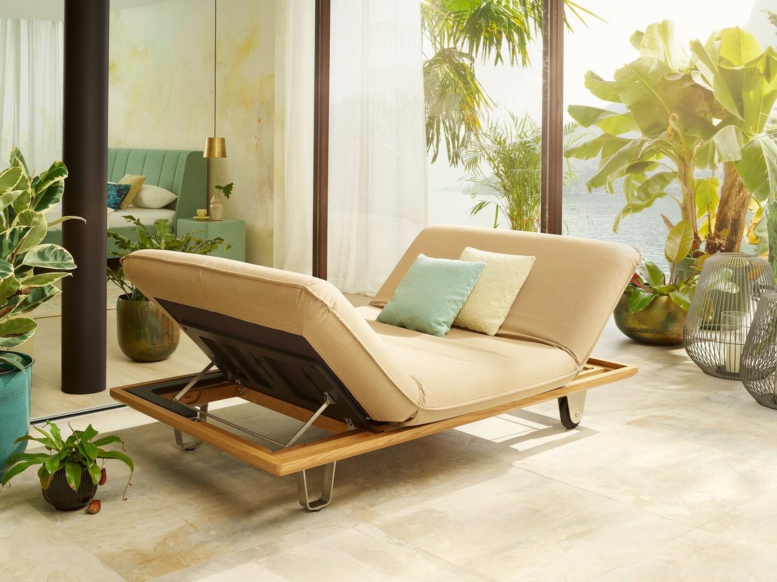 Bezogen wird die edle Liege mit UV-beständigen, wetterfesten Sonnensegelstoffen, die bereits bestens im Außenbereich erprobt sind. Der Rahmen aus lasierter Eiche und die Elemente aus Edelstahl verleihen dem Möbel den außergewöhnlichen und hochwertigen Charakter.