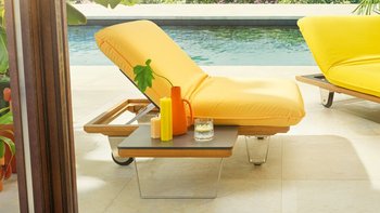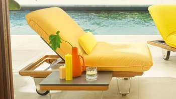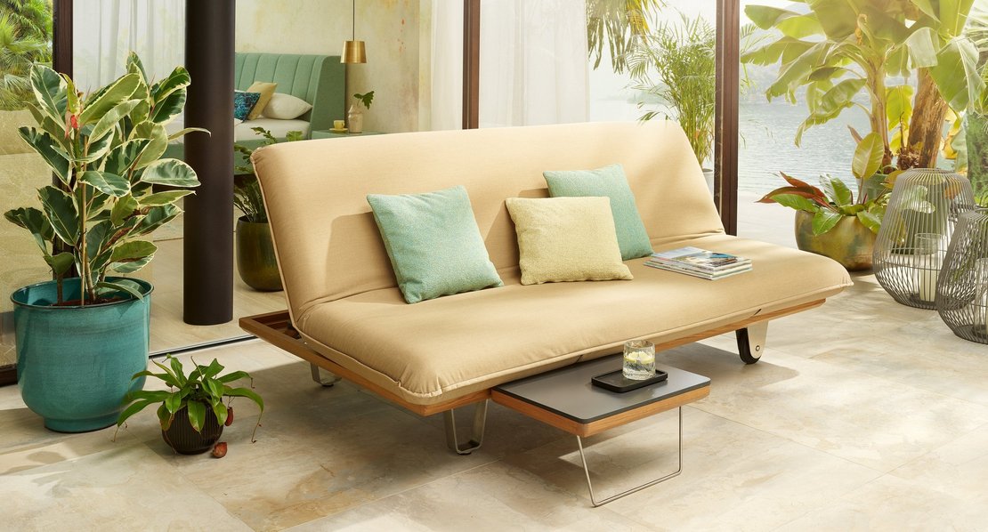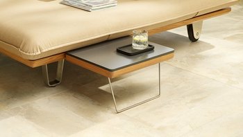 Da die Sonnenliege "Sunbed" sowohl links als auch rechts nach oben geklappt werden kann, quasi wie Schmetterlingsflügel – daher auch der Name Butterfly – machen sogar zwei Einhängetische Sinn. Für diesen Fall gibt es eine integrierte Ablage, die auch zwei Tische aufnehmen kann.