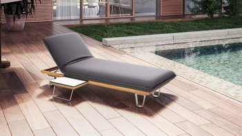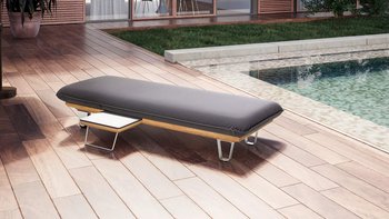 Bezogen wird die edle Liege mit UV-beständigen, wetterfesten Sonnensegelstoffen, die bereits bestens im Außenbereich erprobt sind. Der Rahmen aus lasierter Eiche und die Elemente aus Edelstahl verleihen dem Möbel den außergewöhnlichen und hochwertigen Charakter.