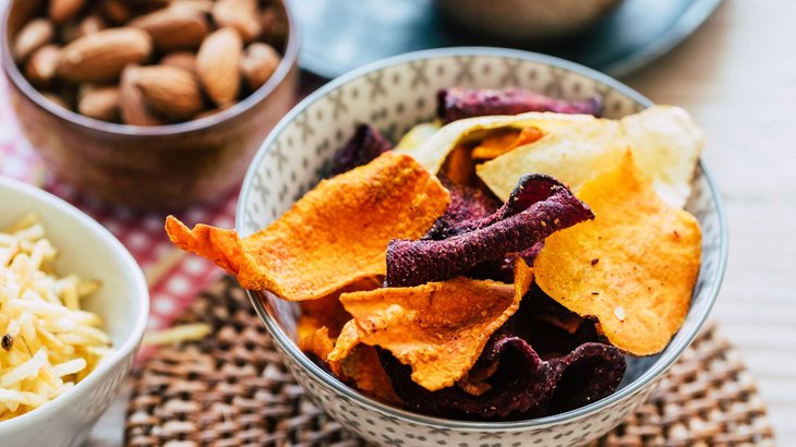 Frittierte Kartoffelchips aus dem Supermarkt sind ein kalorienreicher und ungesunder Snack, den Sie aber ganz einfach selbst viel gesünder zubereiten können. Sie können klassische Kartoffeln verwenden, aber auch die violetten oder roten Sorten, um den Gemüsechips etwas Farbe zu verleihen. Auch Süßkartoffeln, Pastinaken, Karotten, Grünkohl oder Zucchini eignen sich sehr gut als Gemüsechips. Hobeln Sie das Gemüse in dünnen Scheiben und legen Sie die Scheiben auf ein Backblech mit Backpapier und lassen Sie Gemüsechips bei ungefähr 100 Grad Umluft knusprig backen. Alternativ können Sie die Gemüsechips auch im Dörrautomat zubereiten. Anschließend salzen und genießen!