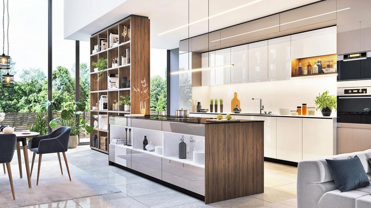 Sie haben eine große Wohnküche mit Essbereich? Dann nutzen Sie Regale als Raumteiler, denn die erfüllen sogar zwei Funktionen. Zum einen können Sie den Platz wunderbar als Stauraum nutzen und zum anderen verleihen Sie dem Raum eine gewisse Gemütlichkeit. Durch halbhohe Regale haben Sie nicht das Gefühl, dass der Raum komplett abgetrennt ist und trotzdem steht Ihnen noch genügend Stauraum zur Verfügung. Zusätzlich können Sie auf einen halbhohen Raumteiler noch Pflanzen stellen, die den Raum optisch trennen.