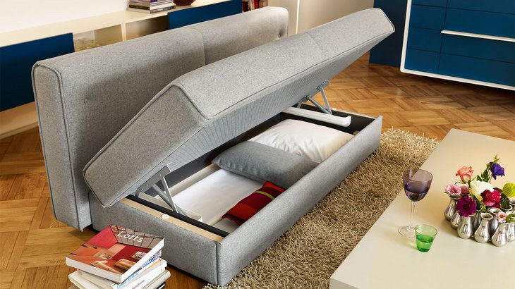 In einer Couch mit Stauraumfunktion lassen sich bequem und „unsichtbar“ viele Sachen unter der Sitzfläche verstauen. Dieser Stauraum ist der richtige Ort für Dinge, die Sie nicht täglich benützen und vielleicht nur während der Winter- oder Sommersaison benötigen. So können Sie im Stauraum der Couch Winterkleidung und Bettzeug verstauen oder den vorhandenen Platz für die Sitzkissen der Balkonmöbel nutzen.
