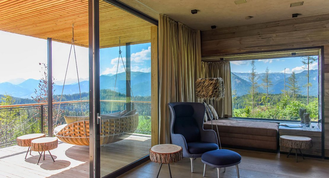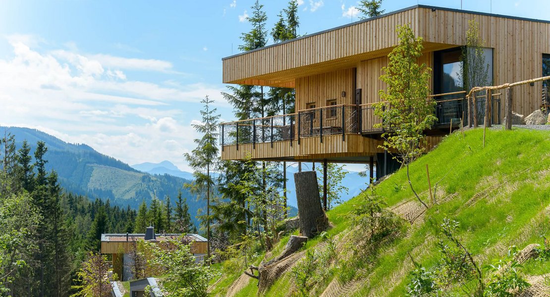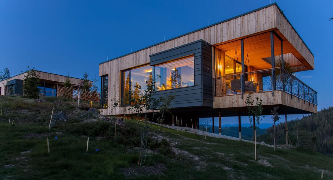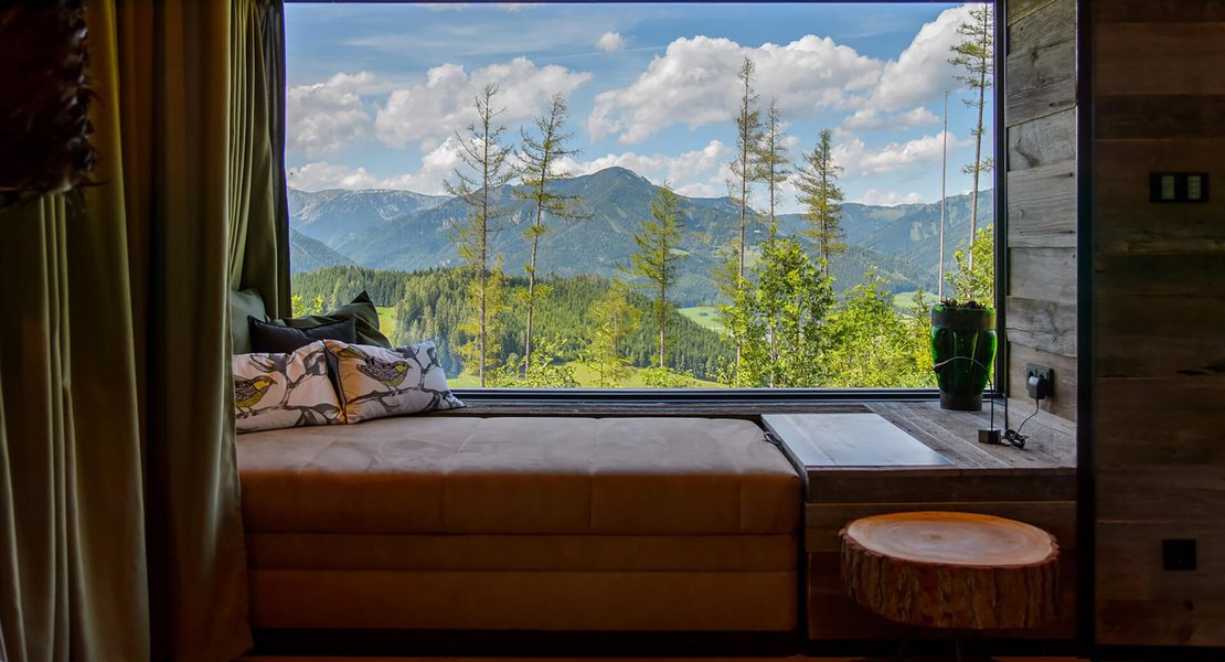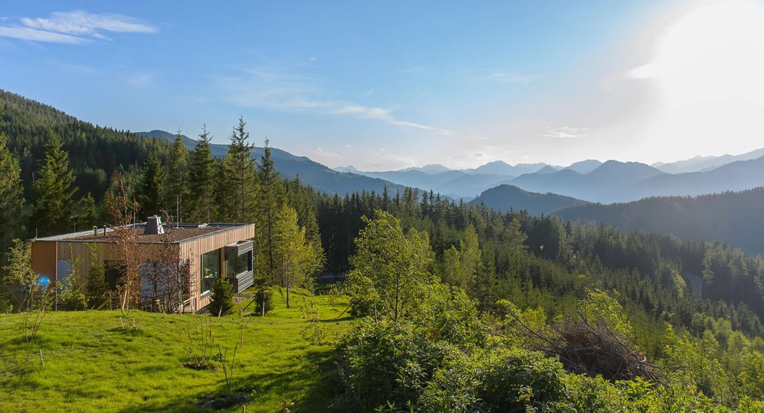 Vier alpine Hütten im wunderbaren Bergpanorama des steirischen Pogusch: Im freien Gelände entlang eines Bergkammes nördlich des bestehenden Wirtshauses Steirereck, wurde auf einer Gesamtgrundstücksfläche von 5.330 m² unter dem Projektnamen "Vogelhäuser Deluxe" vier freischwebende Berghütten in die Landschaft integriert. Das Grundstück liegt eingebettet in Wäldern mit einem traumhaften Ausblick in Richtung Turnau und dem Hochschwab und sorgt für exklusives Sommerfrische-Feeling in der Hochsteiermark. Diese besonderen Ausblicke galt es einzufangen und im Gebäude festzuhalten.