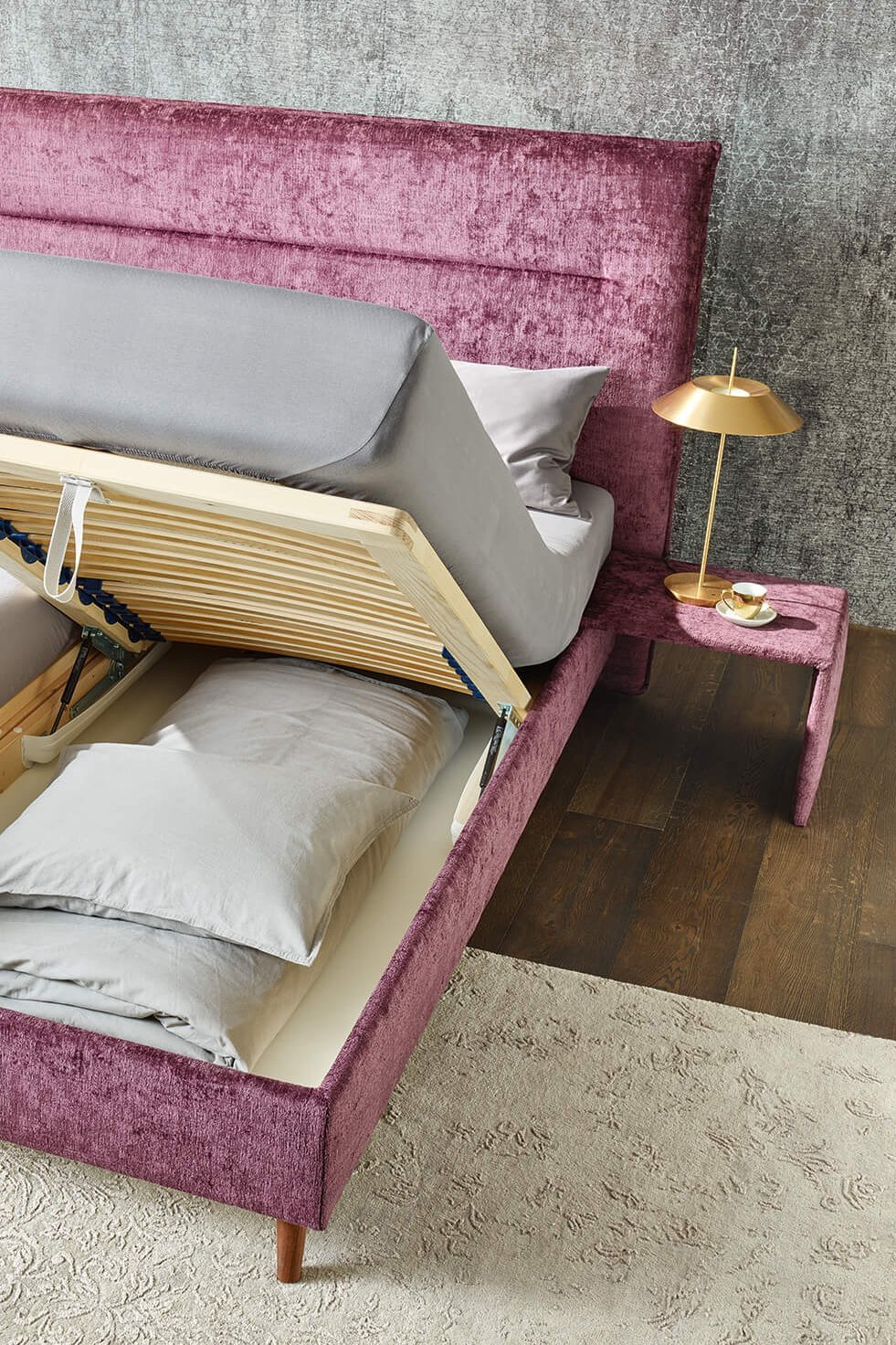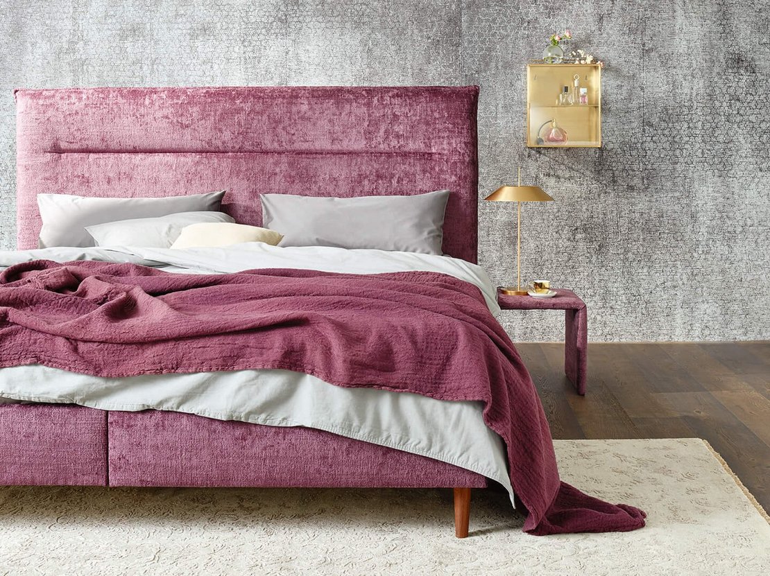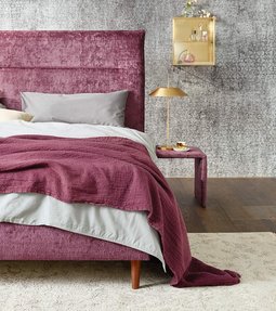 Die perfekte Ergänzung zu Bett und Kopfhaupt bilden die stoffbezogenen Nachtkästchen.