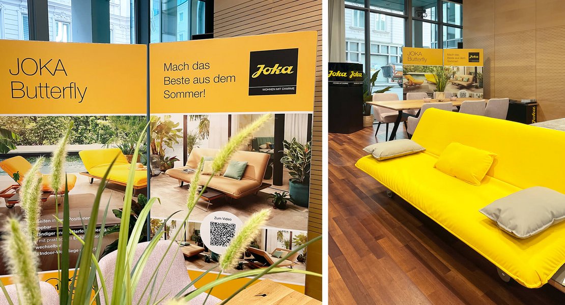 Auf den rund 75m² Ausstellungsfläche, werden die beliebtesten JOKA Möbel aus den Bereichen Wohnen und Schlafen in einladenden Raumsituationen präsentiert. Die perfekte Beratung ist durch die langjährige JOKA Mitarbeiterin Brigitte Wieser sichergestellt. Unter den Ausstellungsstücken hat auch die vor kurzem entwickelte Outdoormöbel-Serie Butterfly Platz gefunden, für die JOKA heuer mit dem Red Dot Design Award ausgezeichnet wurde. Die Serie Butterfly bietet Luxus für Terrasse und Balkon.