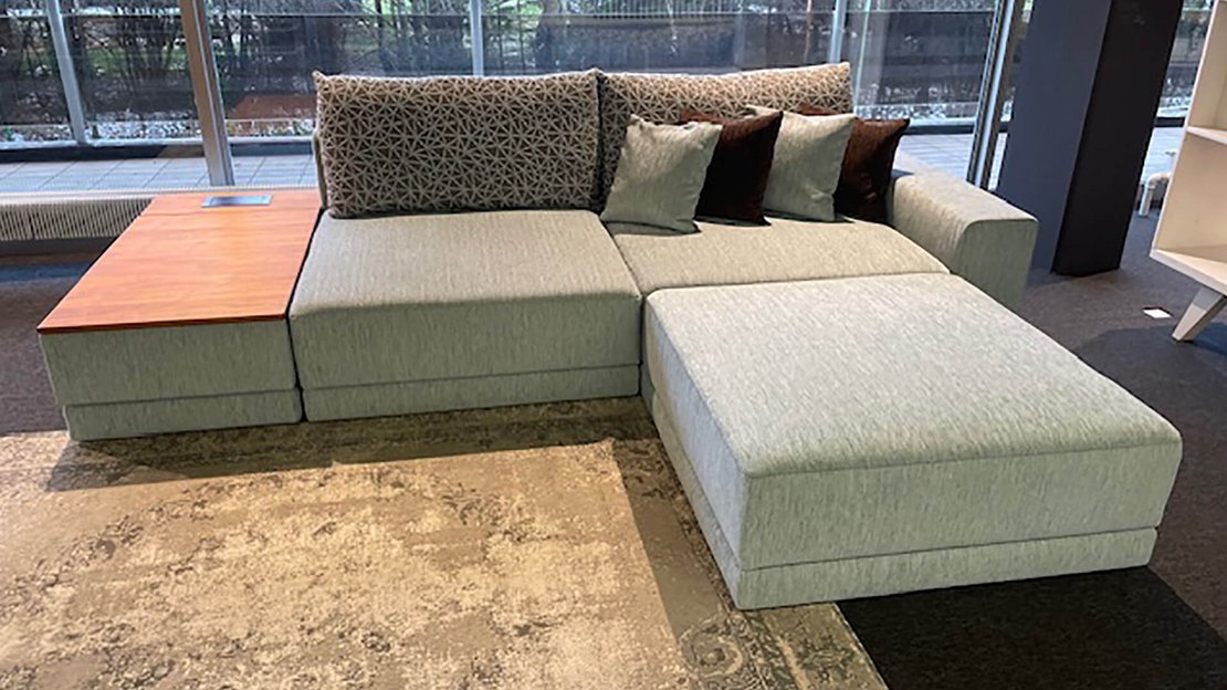 Wohnserie Laguna bestehend aus Tischelement elektrisch HF 62 Nuss geölt Mod. 622/0, Sitzelement mit Rückwand Mod. 620/1, Sitzelement mit Rück- und Seitenwand Mod. 620/2, Sitzelement Mod. 620/0, 2x Rückenlehnkissen Mod. 72/6, 3x Verbindungsschienen Mod. 62/0, 4x Zierkissen Mod. 71/2
