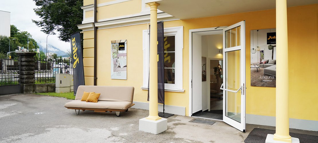 Der neue JOKA Schauraum in der Völkendorfer Straße 1 in Villach grenzt an die Fußgängerzone und ist ebenerdig in einer Villa zu finden, in der auch das stadtbekannte Café „Die Greißlerei“ untergebracht ist.