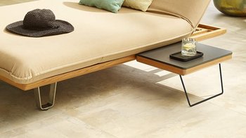 Für die Wohnliege stehen insgesamt fünf Fußvarianten zur Verfügung. Ein echtes Must-have ist der dazugehörige Einhängetisch. Er kann an allen vier Seiten eingehängt und in jede beliebige Stellung verschoben werden. Wenn er nicht gebraucht wird, können Sie ihn ganz leicht im Möbelgestell verstauen.