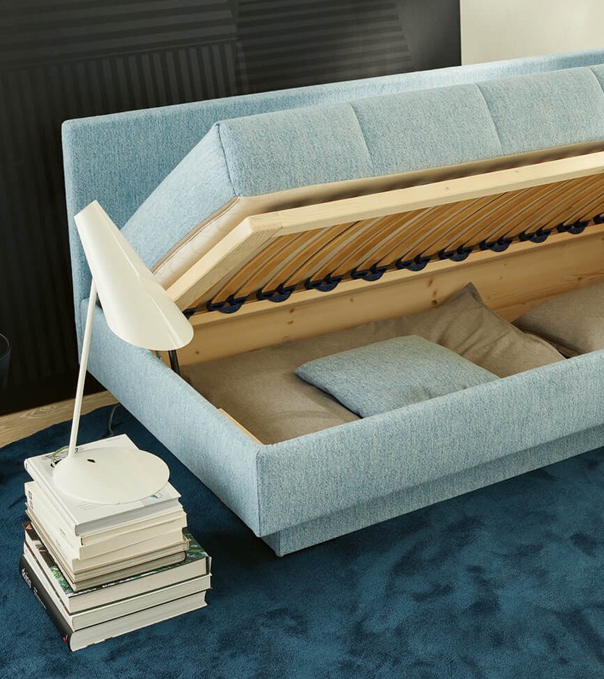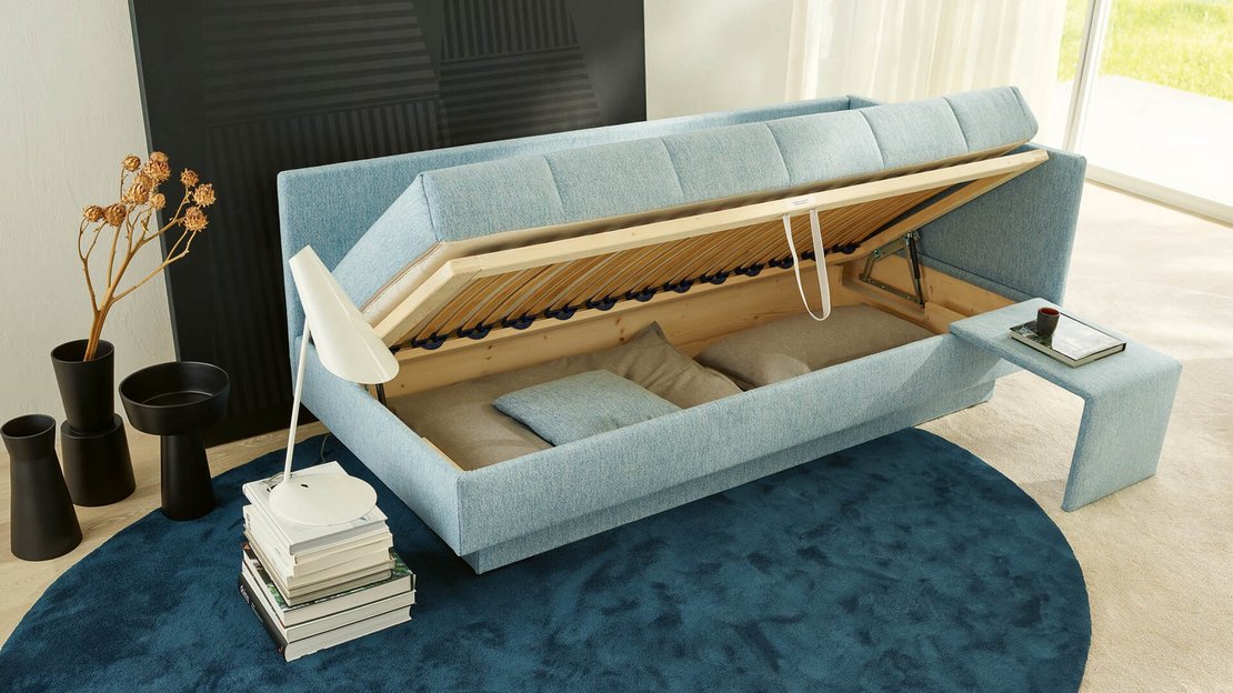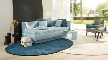Aufgrund des perfekten Sitz- und Liegekomforts kann Calma außerdem je nach Bedarf als vollwertiges Einzelbett oder als großzügige Couch genutzt werden – dafür stehen Ihnen unsere Matratzen, die auf einer Seite mit Möbelstoff und auf der anderen mit einem Matratzenbezug ausgestattet sind, zur Verfügung. Ganz besonders praktisch ist auch der großzügig dimensionierte Stauraum, der – wie immer bei JOKA – ganz leicht nach oben zu klappen ist. Wählen Sie außerdem aus verschiedenen Fuß- und Armvarianten, um sich Ihre ganz persönliche Liege zu kreieren.